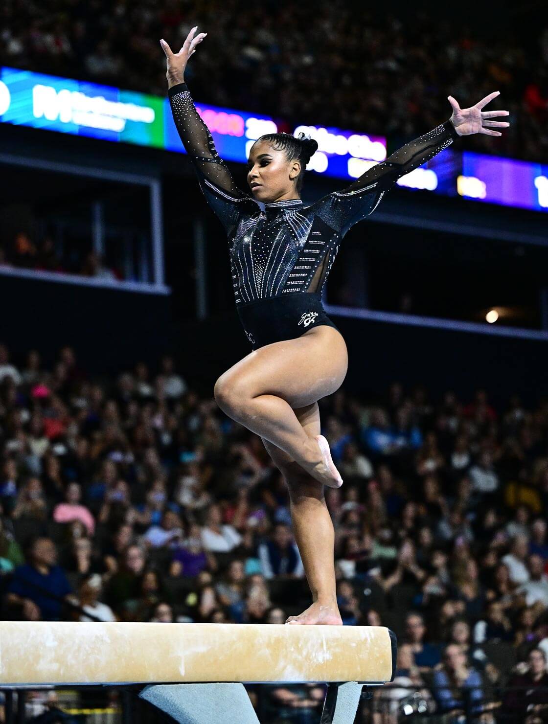 Inspired by a look that owned the moment. This bold replica channels the energy and power Jordan Chiles brought to the floor at the 2023 U.S. Classic. Featuring a striking design inspired by her unforgettable competition leotard, this look blends fierce elegance with performance-ready details that demand attention. From high-energy routines to high-impact style—this leotard brings the fire Jordan is known for.